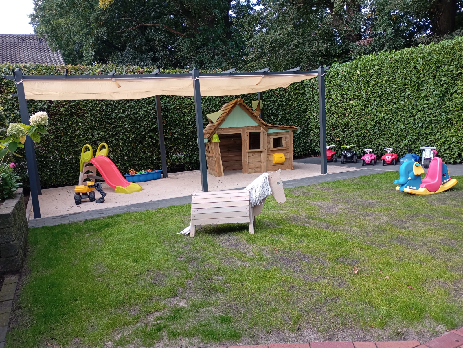 Unser großer Garten, ist rundherum durch eine Hecke eingefasst und in zwei Bereiche unterteilt - einen privaten Teil für unsere Familie und einen eigenen, abgetrennten Bereich für die Tageskinder. Somit habe ich ein kleines Paradies für Kinder. Sie können nach Herzenslust mit dem Bobby Car fahren, im
